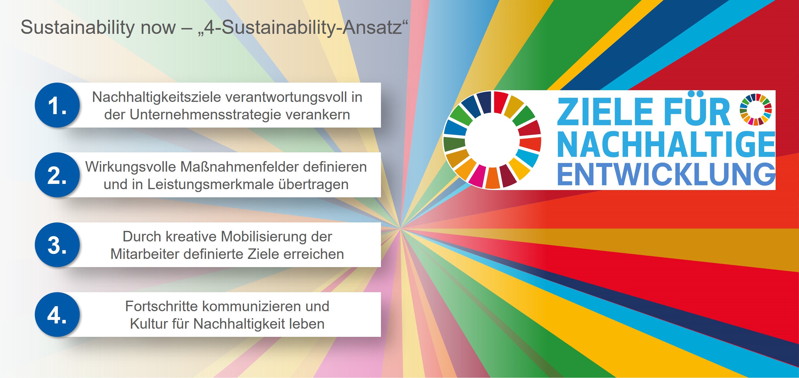 Eine gute und effektive Möglichkeit zur Integration und Umsetzung der Nachhaltigkeitsziele bietet unser „4-Sustainability-Ansatz“. Mit diesem können Sie Ihre Nachhaltigkeitsziele klar und nachvollziehbar definieren und nachvollziehbar beschreiben, damit nach innen und außen eine gute Umsetzung und die gewünschte kommunikative Wirkung gelingt.